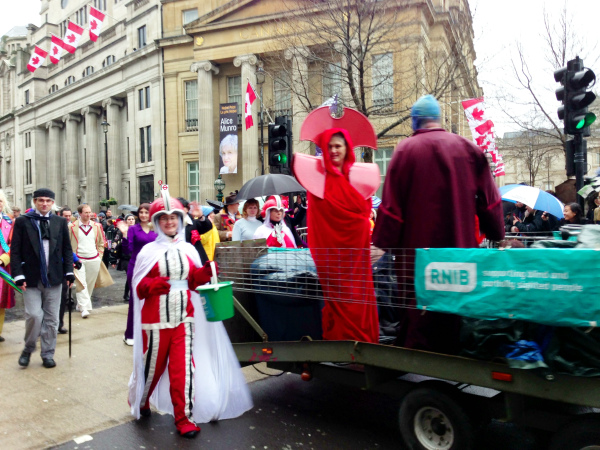 We could have kept sleeping, but rolled out of bed after 10:00 am. I’m always happy when my kids sleep in when I need it. One look out the window and we weren’t too excited about the weather for the big parade. Lynn, Jace and I decided to check out the tail end, hoping by then the horrible wind and rain would have calmed. We made it to Trafalgar Square and found a front row spot surprisingly. The weather must have thinned the crowds more than usual. I think we must have missed the best performers though, as most were young bands from the U.S. or random small groups. The guy next to me was sure excited to see the cast of Mr. Who, something I have no knowledge of. I felt really bad for all the drenched performers-they must have been freezing.